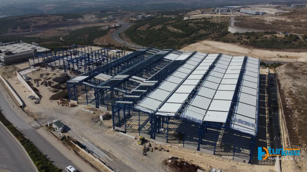 "38.000 m² gibi devasa bir yapı alanına ve 65.000 m² çatı-cephe kaplamasına sahip olan bu proje; 7.500 ton çelik konstrüksiyon ağırlığıyla inşa edilmiş, yüksek yük taşıma kapasitesine sahip, endüstriyel mimarinin en güçlü örneklerinden biridir."